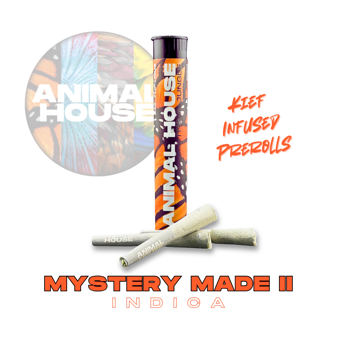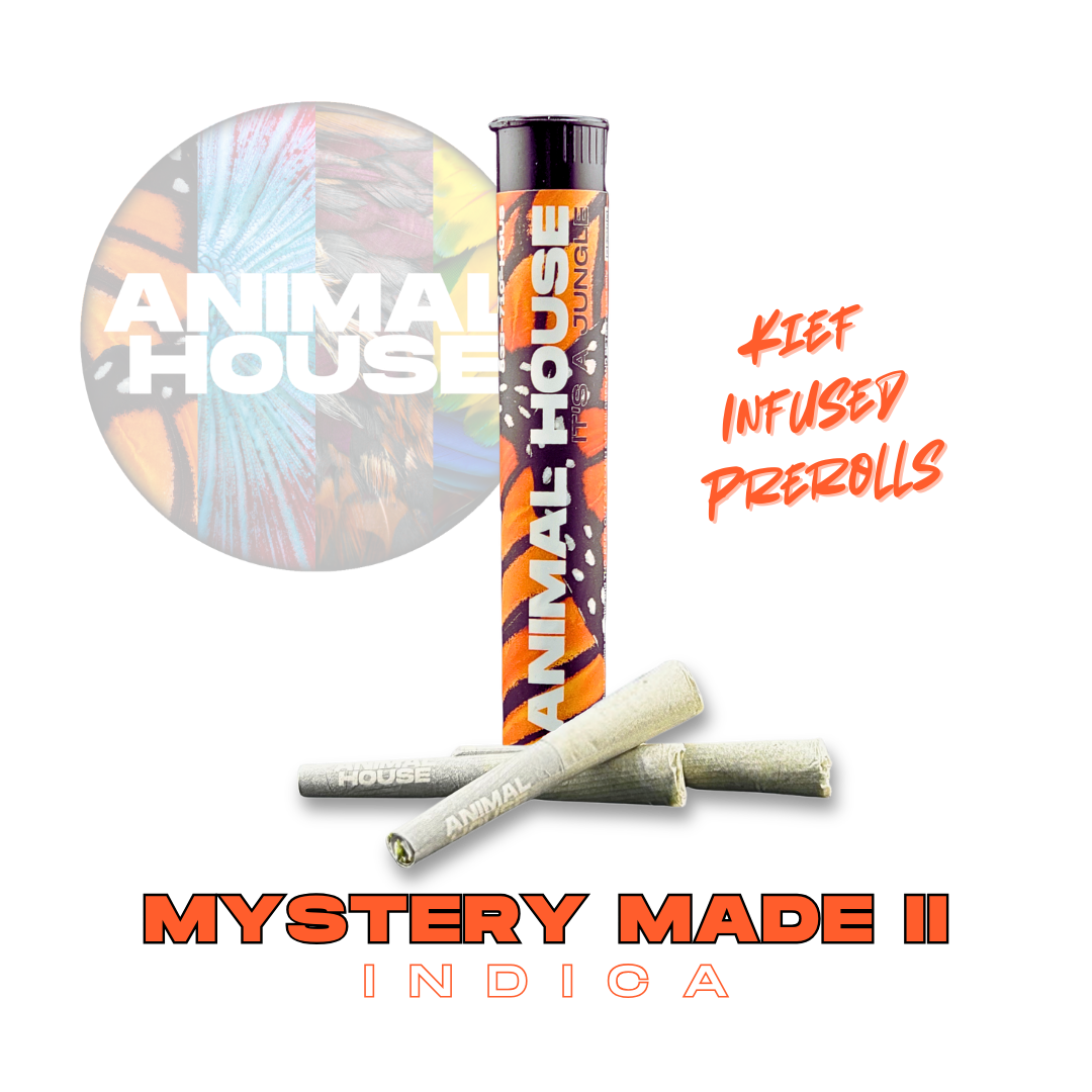 Mystery Made II is an Indica (70% indica/30% sativa). Lineage consists of RS11 x Jealousy. Featuring dense, crystal-coated buds showcasing a stunning mix of vivid greens, rich purple hues, and striking orange hairs. Its aroma combines sweet, fruity tones with subtle earthy and spicy undertones, captivating the senses from the first whiff. Perfect for sparking creativity, easing stress, or uplifting your mood, Mystery Made II never fails to deliver. Animal House kief infused prerolls are are meticulously crafted with the perfect blend of pure ground flower and resinous, terpene rich kief to deliver strong effects and a flavor profile that tantalizes the senses.