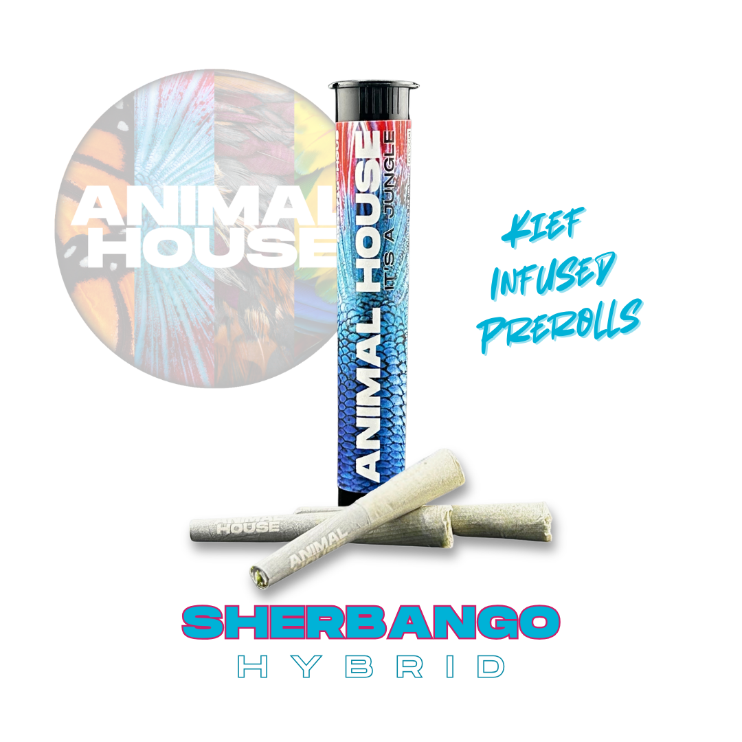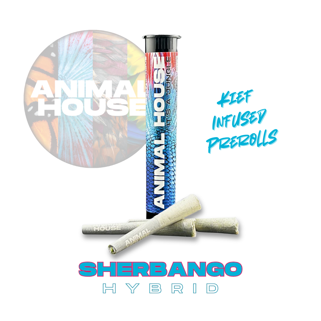 Animal House kief infused prerolls are are meticulously crafted with the perfect blend of pure ground flower and resinous, terpene rich kief to deliver strong effects and a flavor profile that tantalizes the senses.