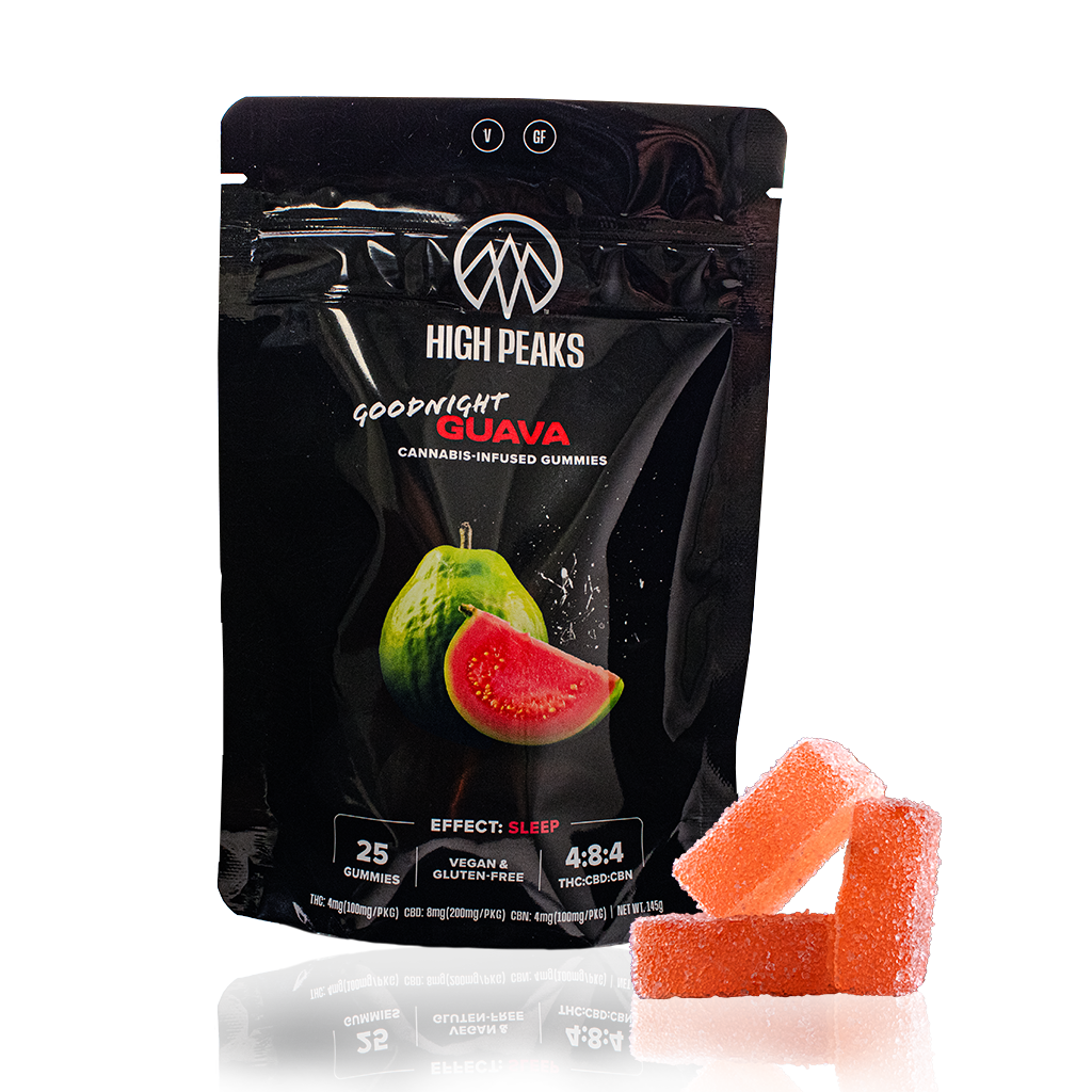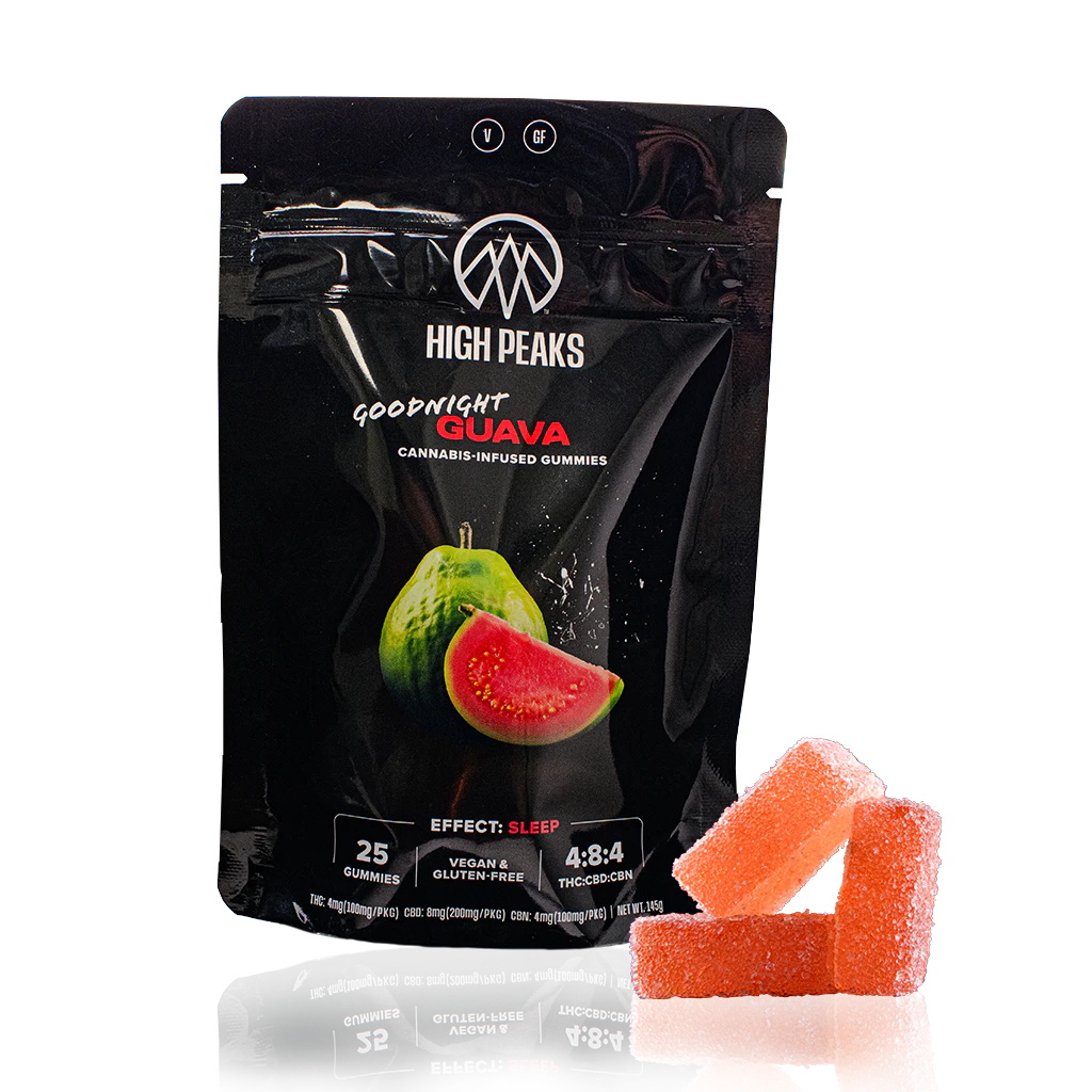 Goodnight Guava Gummies are your ticket to a restorative night’s rest. Infused with a cannabinoid blend that offers a gentle yet effective solution for bedtime bliss. Let the exotic flavor of guava soothe your senses as you drift into a peaceful slumber, knowing that every chew brings you one step closer to a rejuvenated morning. 4mg THC, 2mg CBD, and 8mg CBN per serving ensures a tranquil night's rest. Crafted for a serene experience, these gummies offer the perfect balance of relaxation with a touch of calming CBD and CBN, promising a peaceful night's sleep.