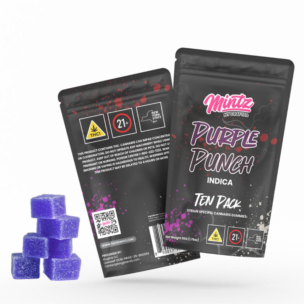 Straight Facts: • Indica strain — relaxing, soothing, body-heavy • Genetics: Larry OG × Granddaddy Purple • Grape + mixed-berry terpene flavor • 10mg per gummy — smooth, consistent effects • Perfect for nighttime use, stress relief, and winding down