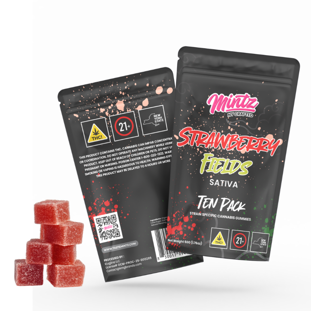 Straight Facts: • Sativa strain — uplifting, creative, and focused • Genetics: Strawberry Banana × Tangie • Real strawberry + citrus terpene flavor • 10mg per gummy — clean, consistent effects • Perfect for daytime use, social energy, or creative flow