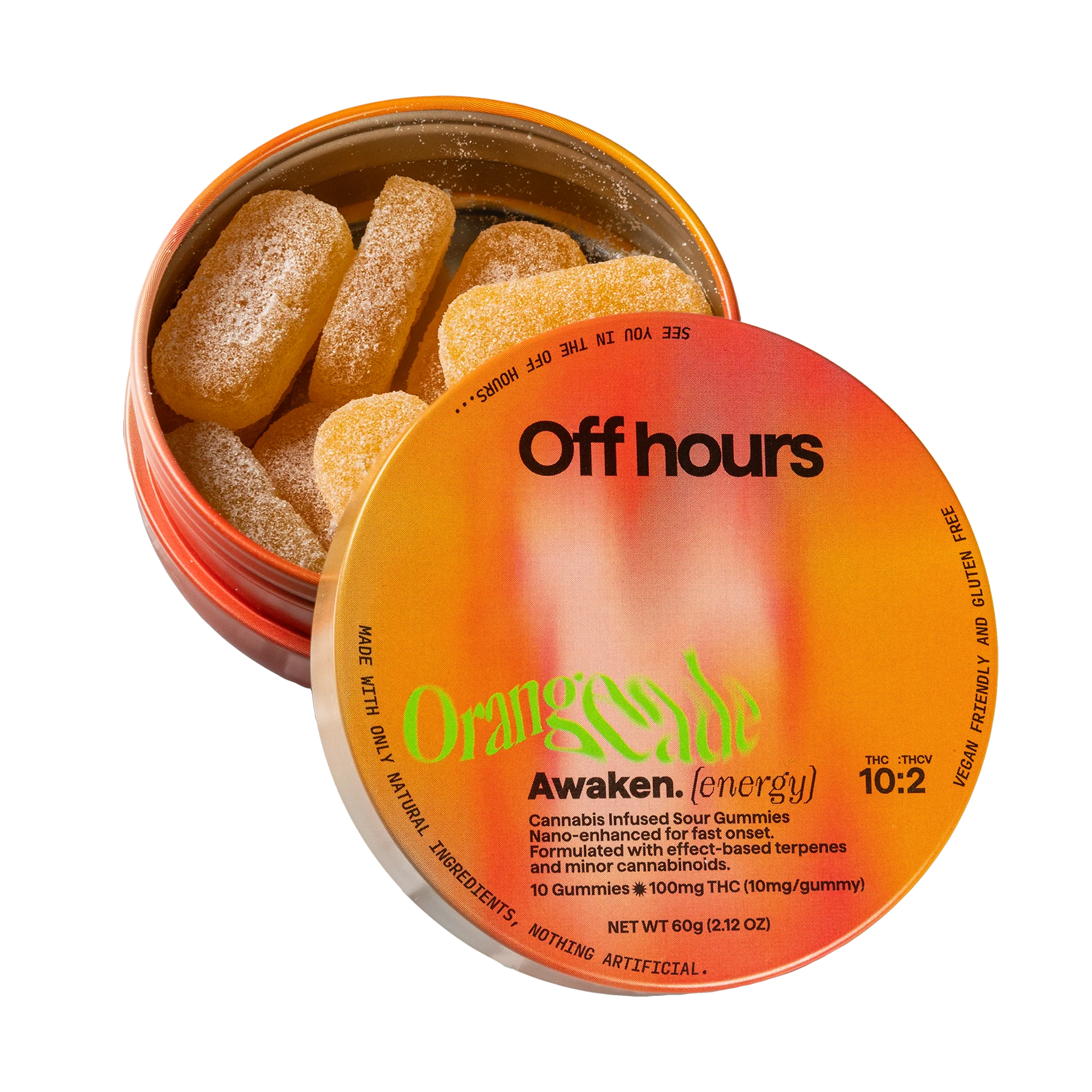 Ready to wake up? Off Hours Awaken Orange Punch gummies are specially formulated with an eye-opening blend of terpenes, THC and THCV to energize your day.