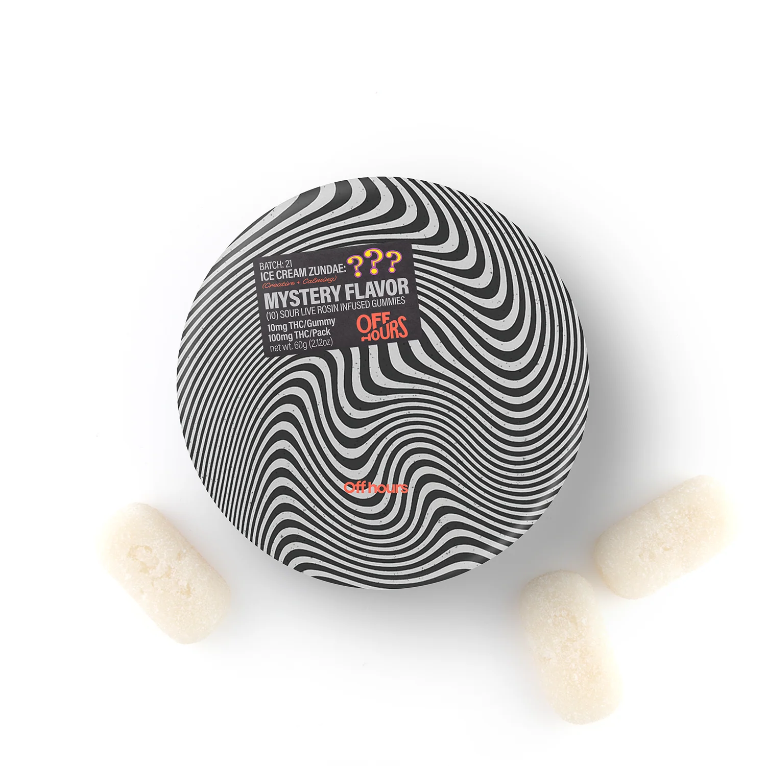 LOOKING FOR A CLUE? NICE TRY. OFF HOURS “MYSTERY FLAVOR” LIVE ROSIN GUMMIES ARE DESIGNED TO KEEP YOU GUESSING. PAIRED WITH ICE CREAM ZUNDAE’S DESSERT AND CANDY NOTES, THEY DELIVER A CREATIVE AND CALMING HIGH THAT MIGHT JUST HELP YOU SOLVE THE MYSTERY... OR NOT.