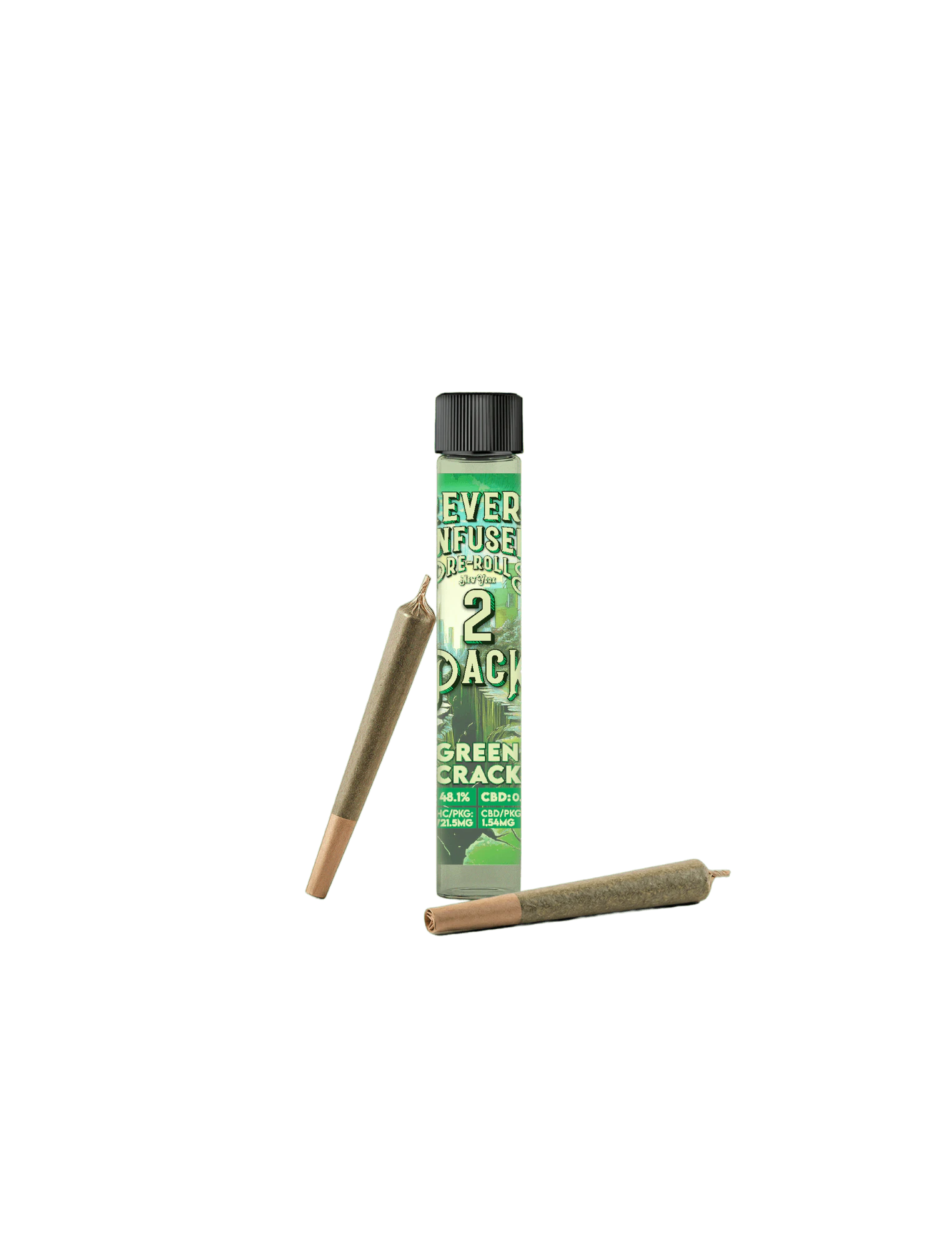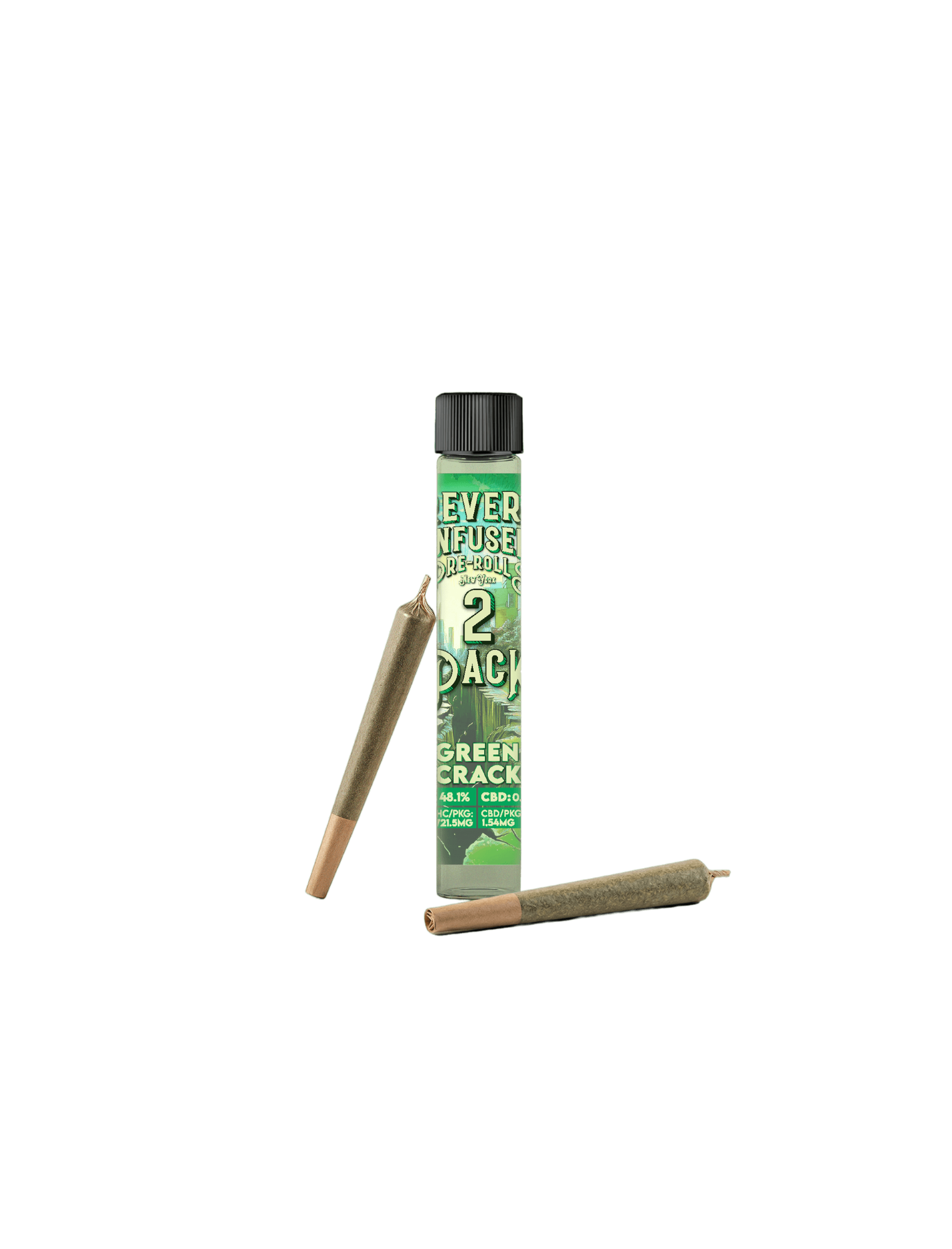 The flavor profile is bright and citrusy, with sharp notes of tropical fruit and light herbal spice. Effects are uplifting and clear-headed, making this a solid choice for daytime use or creative focus. Green Crack infused pre-rolls offer an energetic, sativa-forward experience enhanced with cannabis extract for a powerful yet balanced lift. Each pack includes two 0.75g infused prerolls (1.5g total) designed for smooth pulls and consistent potency. Bold, flavorful, and mentally stimulating.