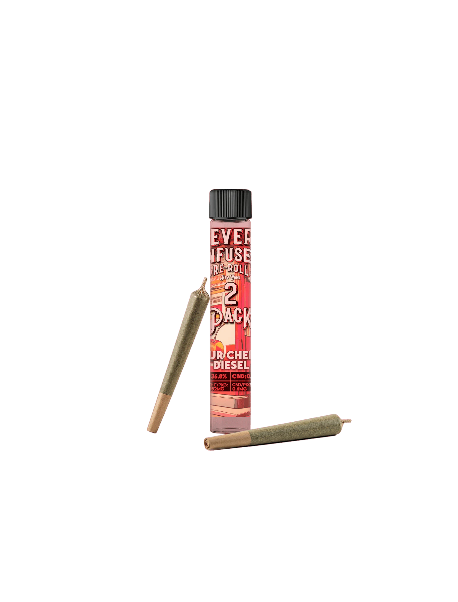 The flavor combines tart cherry sweetness with sharp diesel and earthy undertones, creating a complex and lingering profile. Sour Cherry Diesel infused pre-rolls deliver a bold, hybrid-driven experience elevated with cannabis extract for extra punch. Effects hit with an initial cerebral lift before easing into a calm, steady body feel. Each pack includes two 0.75g infused prerolls (1.5g total) for an even burn and reliable strength. A standout option for flavor and balance.