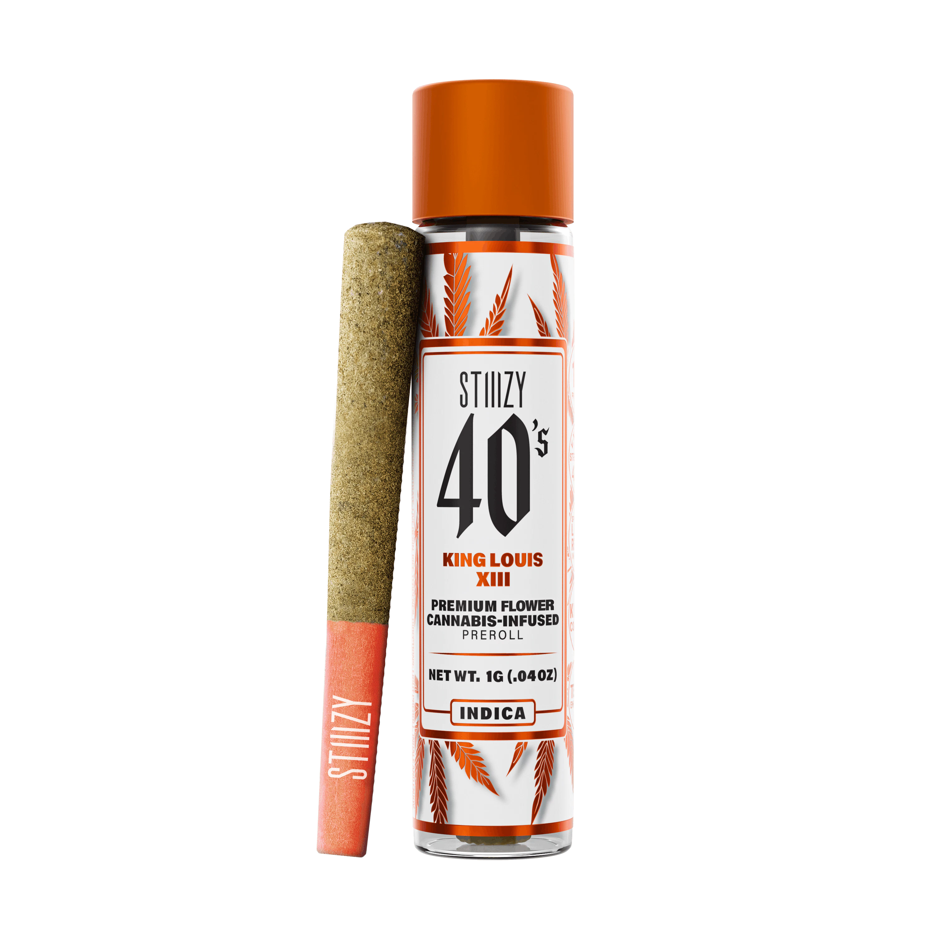 Stiiizy is setting the standard in the pre-roll game with the most revolutionary and innovative products. Elevate your pre-roll game. Stiiizy 40s pre-rolls are setting the standard with high potency, cannabis infused joints coated evenly with kief. Using our proprietary live resin infusion methods, we’ve designed every pre-roll to offer 40%+ THC potency with a unique flavor profile. With a smooth inhale and tasteful exhale, each and every Stiiizy 40 is packed with indoor grown flower, specifically made to ensure a potent and long-lasting high. Spark up the 40s. KING LOUIS XIII / Indica Taste: Mango Description: Noted for its royal caliber in high THC potency, our King Louis XIII 40s gives you a bursting mango flavor which coincides with a powerful high that’s sure to keep you feeling like a king. Feeling: Happy, Relaxed, Euphoric