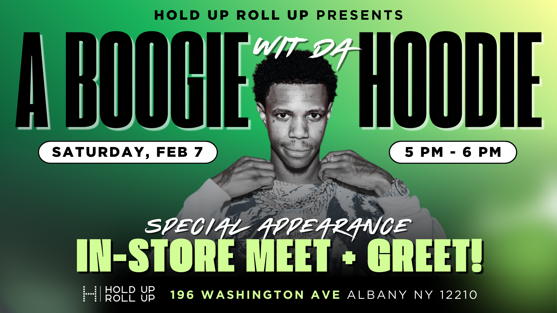 Featured February 7 @ 5:00 pm - 6:00 pm Hold Up Roll Up Special Appearance with A-Boogie Wit Da Hoodie Hold Up Roll Up 196 Washington Avenue, Albany, NY, United States