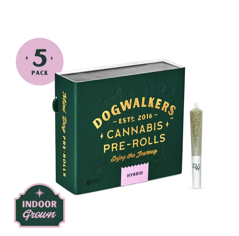 Dogwalkers “STAY” Mini Dog pre-rolls offer a total of 1.75g hybrid flower. Conveniently packaged in an on-the-go tin, each .35g miniature pre-roll (five total) is always crafted with strain-specific premium flower; never shake, stems or seeds. Dogwalkers donates a portion of proceeds from every product sold to deserving animal shelters across the country.
