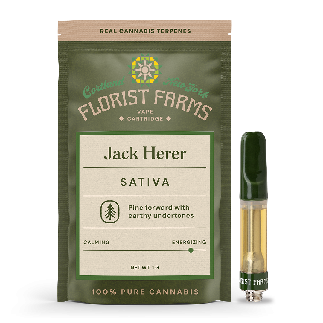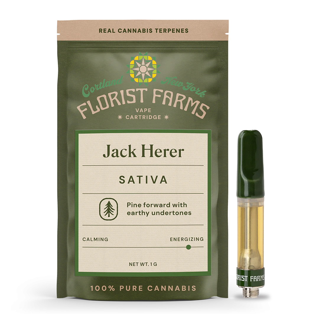 Jack Herer | Sativa | 1G Vape CartridgeAbout This ProductIf you’re looking for a cart that actually tastes like cannabis, this is it - no added flavors, just real, pure cannabis that hits smooth every time.Effect: SativaFlavor: Pine forward with earthy undertonesIngredients: 100% Pure Cannabis Oil and Cannabis TerpenesWhy We Love Florist FarmsLocated in Cortland, NY, Florist Farms is committed to sustainability. They practice regenerative farming by growing in living soil, using organic compost, and never using pesticides. For over a decade, they have been organic vegetable farmers and donate produce weekly to help support their community. Our friends at Florist Farms are deeply committed to quality and to delivering the cleanest cannabis products in New York State.No artificial flavoring • No botanical terpenes • Zero cutting agents