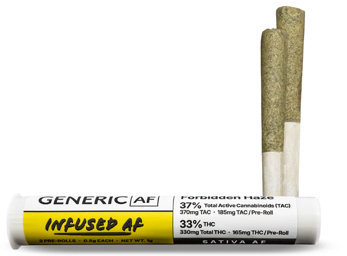 Generic AF Sativa Blend Forbidden Haze 2pk Prerolls deliver an energizing and flavorful smoke thats perfect for daytime enjoyment. Each preroll is rolled with a sativa-dominant blend centered around Forbidden Haze, a strain celebrated for its uplifting cerebral effects and bold, hazy flavor profile. The cannabinoid profile is THC-forward, with minor cannabinoids adding balance and nuance to the high. Terpenes like terpinolene, limonene, and caryophyllene dominate, offering a zesty citrus aroma layered with herbal spice, earthy haze, and a touch of sweetness.