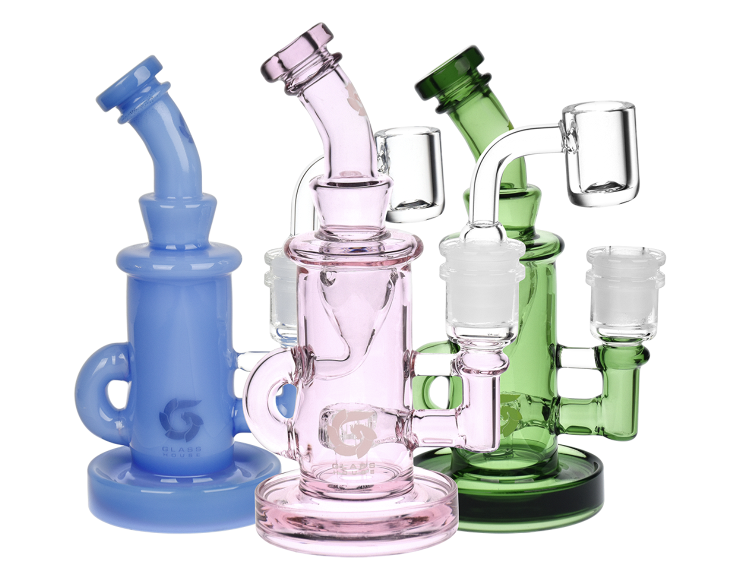 The Mini Incycler Dab Rig from Glass House stands 5.75 inches (14.6cm) and are crafted with an incycler style build that cycles water to cool smoke and prevent residue build-up. Made of quality borosilicate glass, the rig has a circ percolator and includes a 14mm male flat top quartz banger. Colors vary.
