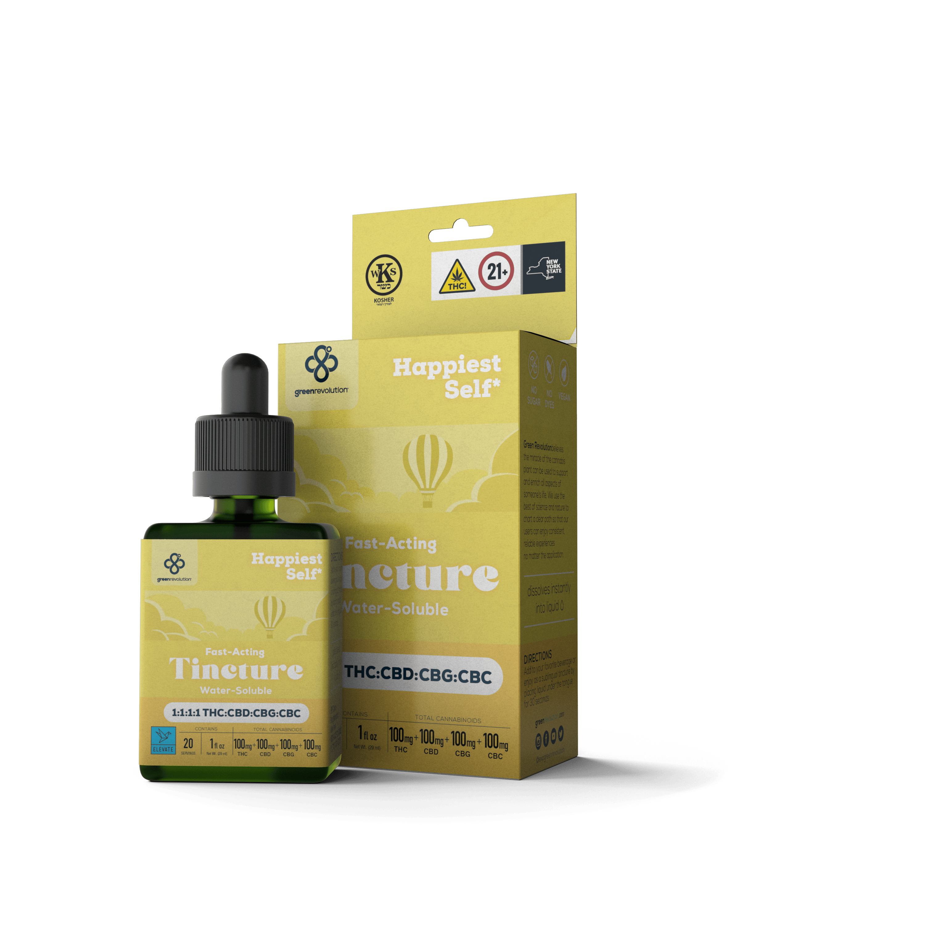 Embrace your Happiest Self with our Fast-Acting Tincture, expertly crafted to enhance your well-being. This unique blend of cannabinoids features a 1:1:1:1 ratio of THC, CBD, CBG, and CBC, providing a balanced and synergistic effect to promote relaxation and mental clarity. Water-soluble for instant dissolution, this tincture integrates seamlessly into any beverage, offering a convenient and enjoyable way to adjust your mood and improve your day.