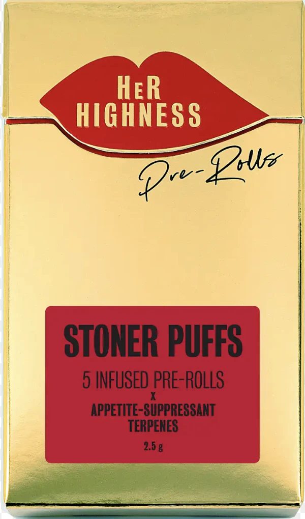 Stoner Puffs provide a euphoric, buzzy, creative high. Designed to be potent, for getting ripped and feeling blissfully stoned. Infused with distillate and appetite-suppressant terpenes high in Humulene, they're low-munchies. Premium Runtz Ether is a cut of Alien Dawg, a hybrid gifting an immediate cerebral rush of lifted euphoria before turning delightfully stonery. Her Highness ultra feminine pre-rolls are slim, elegant and beautiful to smoke, featuring an extra long crutch to protect nails and lashes. (5) .5g cones are presented in our signature CR gold cigarette box. (44.94% THC)