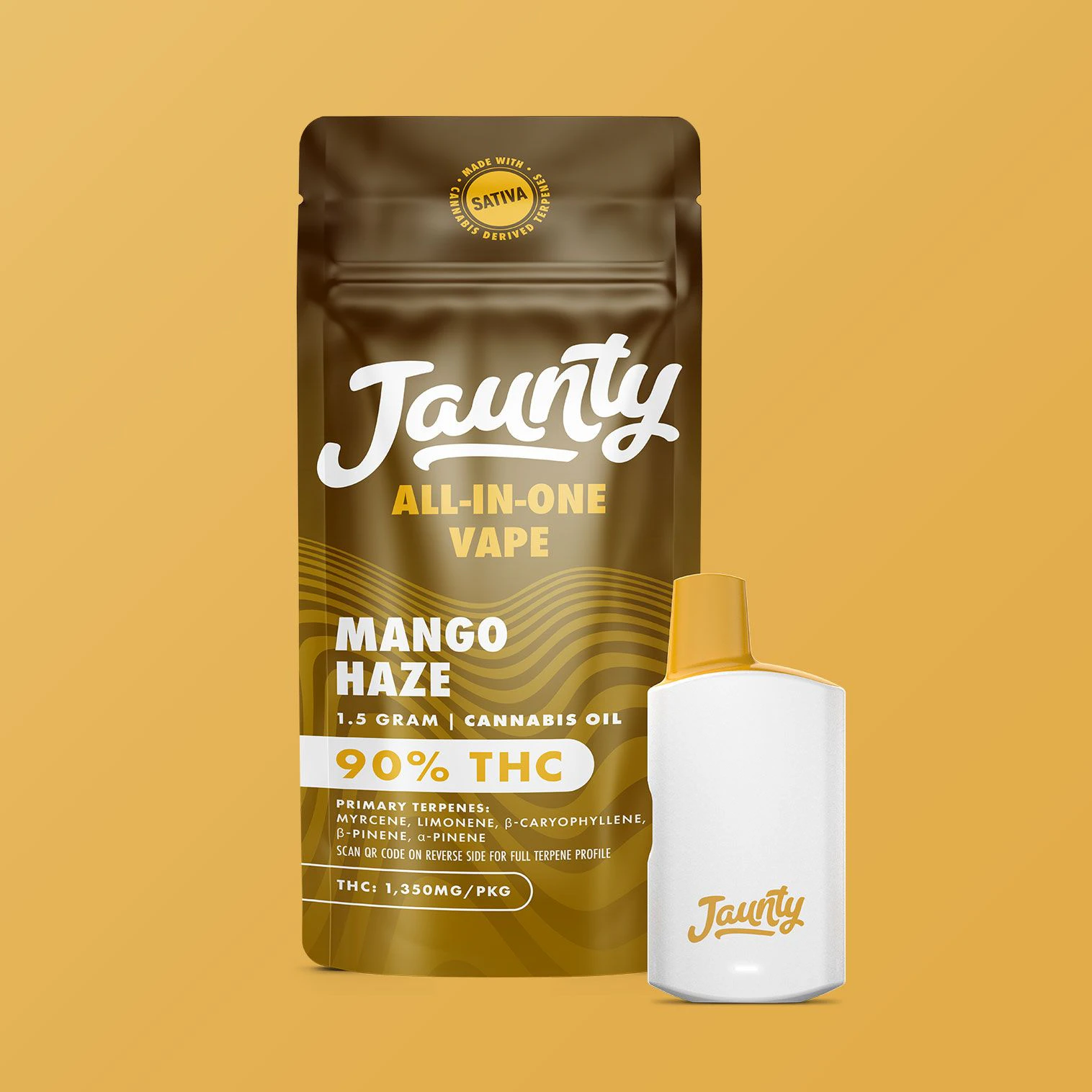 Mango Haze is a sativa known for its uplifting, cerebral, happy effects and a sweet mango aroma and flavor that will keep you coming back for more. Jaunty Palms combine cannabis-derived terpenes with distilled cannabis oil, delivering true-to-strain flavors and effects-driven profiles in a discreet, portable device—ideal for on-the-go use