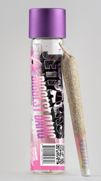Jetpacks Bigger Bang Infused Pre-roll in Purple Punch is a diamond-encrusted, live resin infused preroll crafted for flavor and fire. This 1g powerhouse indica blends premium whole flower with high THCa extract, cannabis oil, and a generous coating of THCa diamonds.