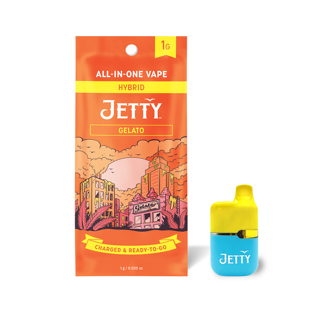 "Gelato is a pretty intense high and a solid choice for relaxing while still keeping focus. Great up-front fruit flavor with hints of earthy Kush on the exhale. Jetty High THC is super-potent and features a variety of legendary cannabis strains. Jetty High THC is made from all-natural and pesticide-free bud grown in Ithica's premier growing region. Pure, potent, and portable, Jetty’s All-in-One Vape delivers everything you want in a vape. Featuring 85%+ THC, and CCell's industry-leading vape technology. Featuring anti-clogging technology and a ceramic core for a smooth smoke from start to finish. "