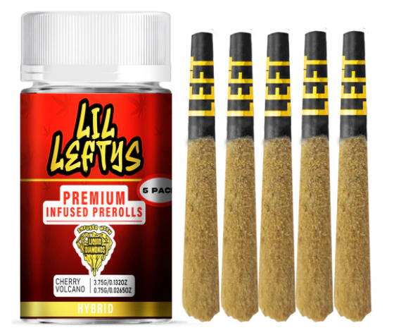 LIL LEFTYS Infused Prerolls are a 5 pack of .75 prerolls for a total of 3.75g — each coated in kief, infused with liquid diamonds, and packed with premium indoor flower for a flavorful, slow burn every time.