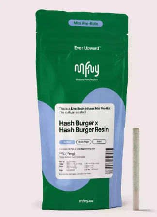 For our resin infused pre-rolls, we start with premium, hand-trimmed whole Hash Burger flower then infuse it with our in-house made Hash Burger live resin HTFSE (High Terpene Full Spectrum Extract from fresh frozen buds). This process creates a higher potency, flavorful product, with a sweet yet spicy and lemony body; finished off by notes of woody pine and fresh flowers from the Hash Burger cultivar. Potent and high in THC this product is a treat for experienced cannabis consumer. No shake, no trim. Just the very best of our craft cannabis, ready to enjoy. Exclusively single-sourced at MFNY in the Hudson Valley.