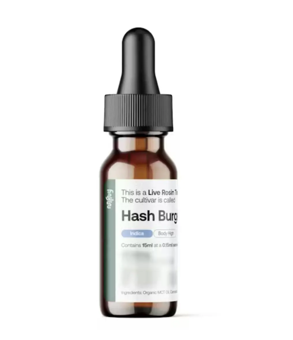 Our tinctures are the """"Liquid Gold"""" of cannabis. Through rigorous research and phenotype hunts, we've found a group of terpenes that need no altering. These premium single-source solventless live rosin tinctures deliver more terps, effects, and flavor - in any dose you want - directly to your endocannabinoid system. (Think of tinctures as a """"nonstop flight"""" for terps.) Organic MCT oil is infused with MFNY's Hash Burger live rosin: unmistakable bold flavor of Hash Burger is sweet yet spicy and lemony, finished off by woody pine and fresh flower notes; known to promote emotional balance and improved appetite with long-lasting, invigorating cerebral effects that spread to your whole body.