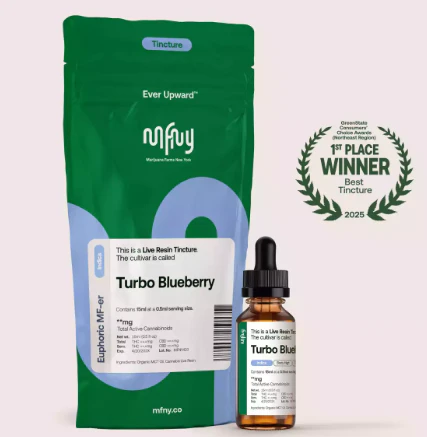 Our tinctures are the “Liquid Gold” of cannabis. Through rigorous research and phenotype hunts, we’ve found a group of terpenes that need no altering. These liquid live resin tinctures deliver more terps, effects, and flavor - in any dose you want - directly to your endocannabinoid system. (Think of tinctures as a “nonstop flight” for terps.) Organic MCT oil is infused with MFNY single source Turbo Blueberry live resin: distinctive soft blueberry aroma of the Blueberry Muffin and Lemon Cane cultivars; known to promote an relieving body high.With activated THC entering the bloodstream at a more rapid rate, people may experience relief from anxiety, pain, and nausea; others say it can create an appetite or aid with sleep. The dropper means that whether you’re a beginner or enthusiast, you can choose a lighter or heavier dose that’s just right (your “Goldilocks Zone”). NOTE: When taken sublingually (under the tongue), effects can take anywhere from 15 mins to 2 hrs to begin, and may last longer than other consumption methods. So make sure to dose conservatively your first couple of tries.