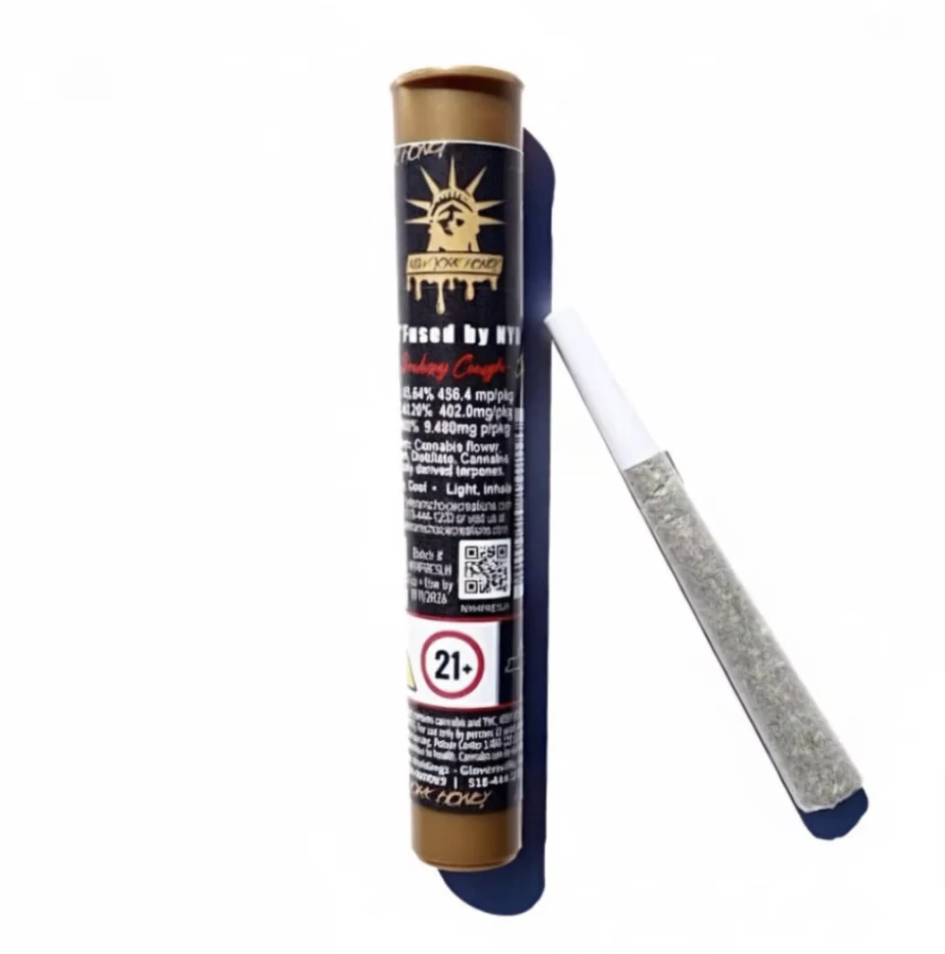 Strawberry Cough brings ripe berry flavor and a cool, silky pull that hits easy every time. It’s a classic sativa that keeps you in a good headspace, light, talkative, and creative. Each pre-roll is dual infused with solventless bubble hash and New York Honey Distillate for steady flavor and a slow, even burn.