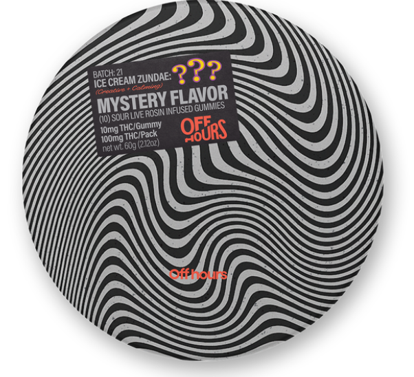 LOOKING FOR A CLUE? NICE TRY. OFF HOURS “MYSTERY FLAVOR” LIVE ROSIN GUMMIES ARE DESIGNED TO KEEP YOU GUESSING. PAIRED WITH ICE CREAM ZUNDAE’S DESSERT AND CANDY NOTES, THEY DELIVER A CREATIVE AND CALMING HIGH THAT MIGHT JUST HELP YOU SOLVE THE MYSTERY... OR NOT.