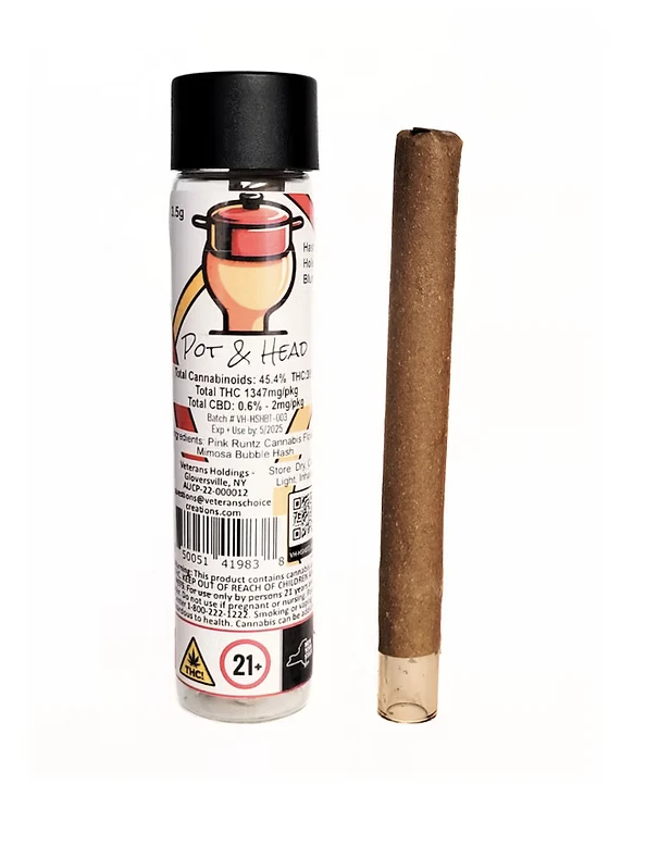 Get ready for a next-level experience with Pot & Head’s 3.5g Hash Hole Blunt featuring Hella Jelly. This hand-rolled masterpiece is packed with 3 grams of premium Hella Jelly flower and 0.5 grams of cured bubble hash, all wrapped in Terp Infused Juicy™ Hemp Wraps for smooth, flavorful hits. The terpenes enhance both the flavor and aroma, making each pull even more enjoyable. The glass tip ensures every hit is clean and cool, so you can fully savor the experience.