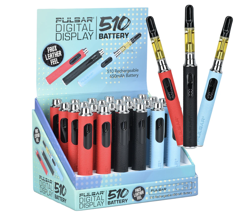 Enjoy the benefits of a smart battery (with class) with the Leather Series Digital Display 510 Battery from Pulsar. Wrapped in smooth faux leather, this cartridge battery has a digital display screen on the side that shows battery life and voltage setting, as well as preheat and charge indicators. With three preset voltage settings to choose from, users can prioritize rich flavors or thick clouds; the preheat function applies a low heat for 15 seconds to liquify crystals and remove clogs. The battery has single button operation and universal 510 threading to work with most vape cartridges