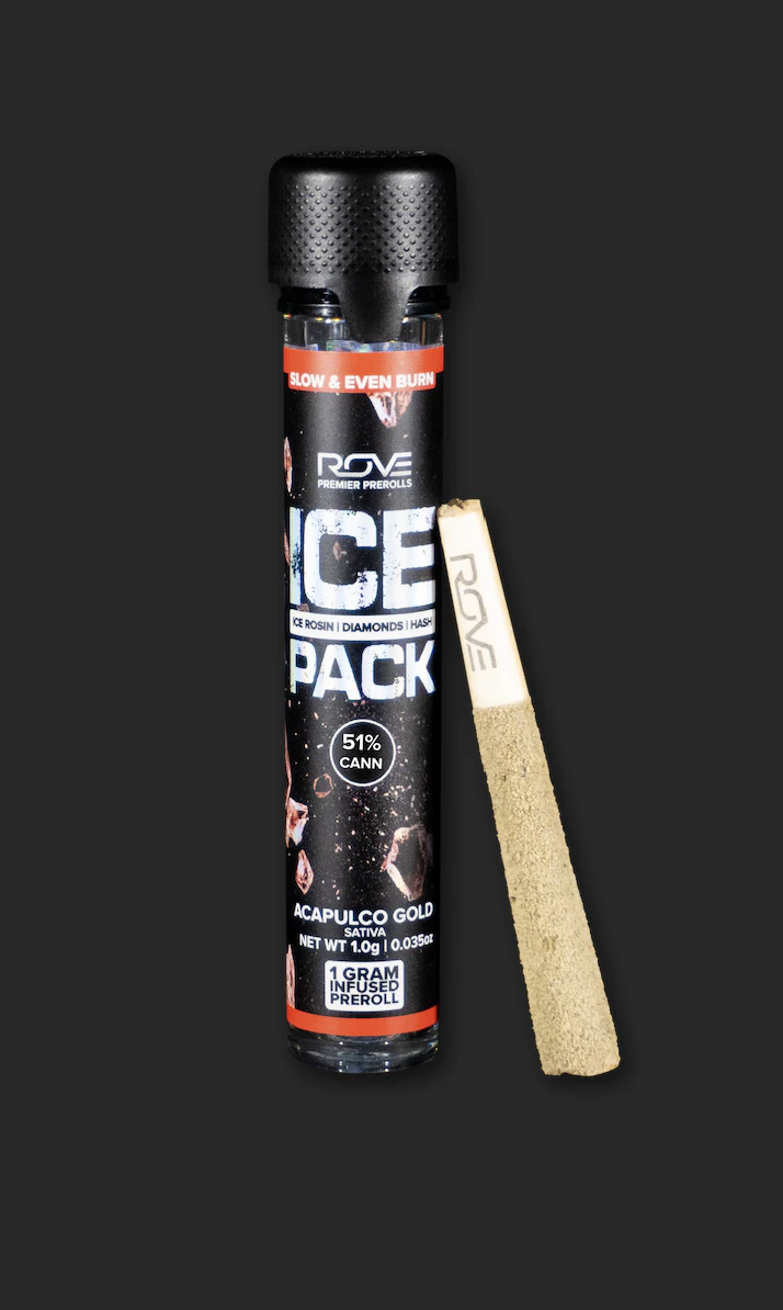 Rove Ice Packs, the world’s first triple-infused preroll. Made with premium-grade flower fully-infused with THCA diamonds and solventless ice hash rosin, they're expertly rolled, then coated with more ice hash. Super smooth and ultra potent, Rove Ice Packs test at over 50% THC. Welcome to the next evolution of prerolls.