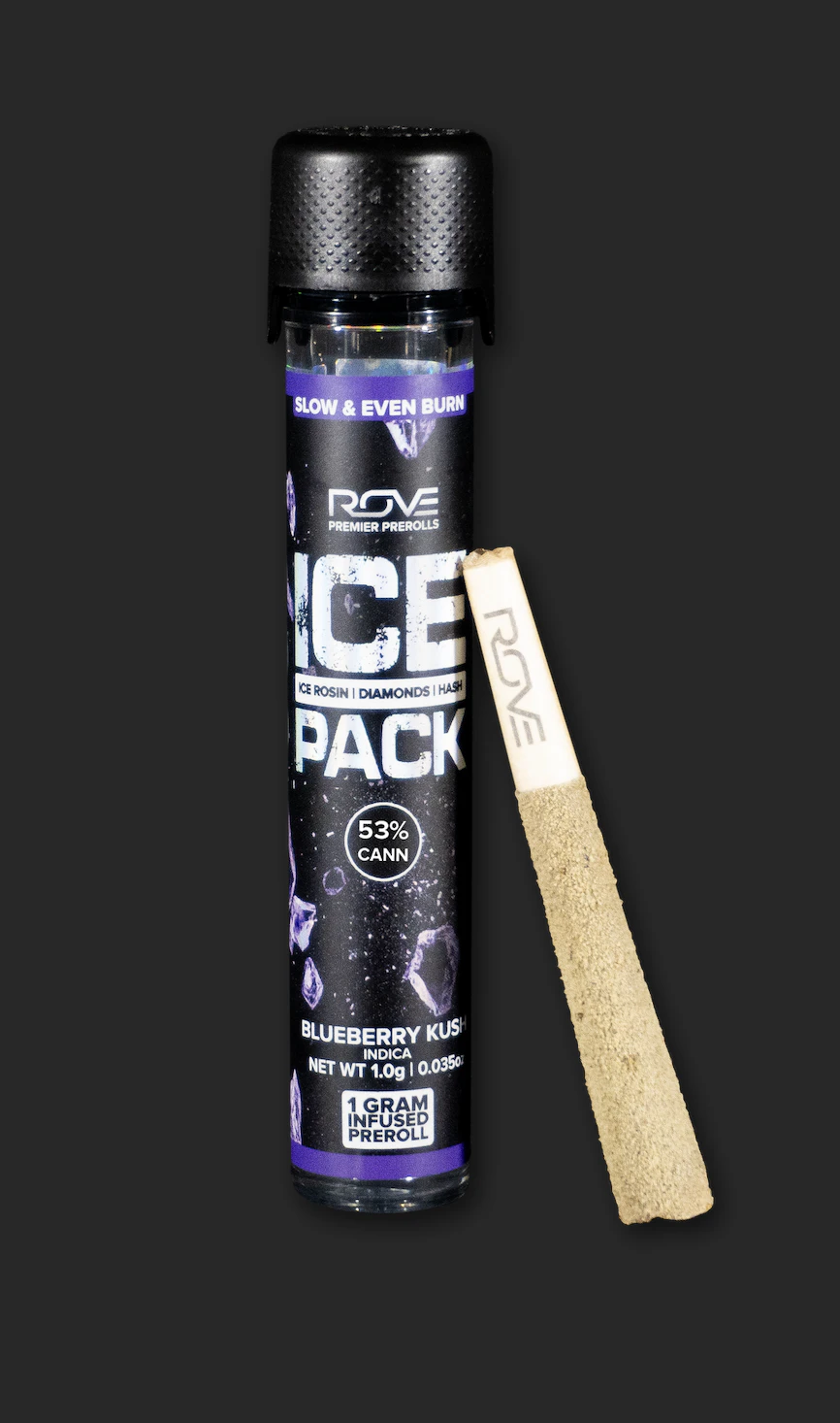Rove Ice Packs, the world’s first triple-infused preroll. Made with premium-grade flower fully-infused with THCA diamonds and solventless ice hash rosin, they're expertly rolled, then coated with more ice hash. Super smooth and ultra potent, Rove Ice Packs test at over 50% THC. Welcome to the next evolution of prerolls. BLUEBERRY KUSH • INDICA