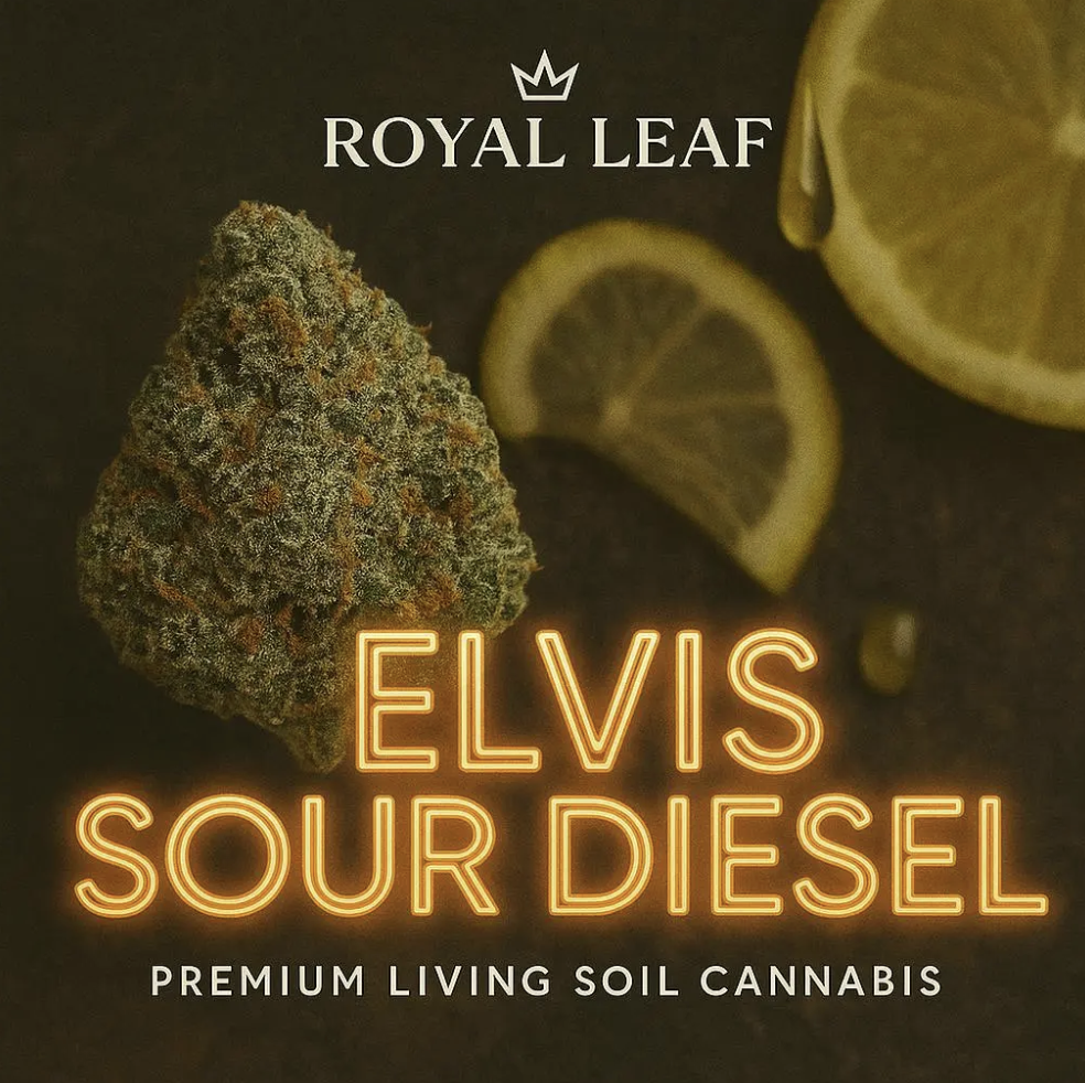 Fuel your day with Royal Leaf’s Elvis Sour Diesel, a sativa-dominant hybrid grown in indoor living soil to maximize terpene expression and flavor depth. This 3.5G premium flower brings together the legendary potency of Sour Diesel with an electrifying twist, delivering sharp notes of citrus, skunk, and gas — all packed into dense, frosty buds.