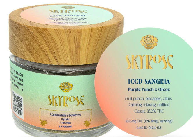 Iced Sangria is a slightly indica dominant hybrid strain (60% indica/40% sativa) created through crossing the classic Querkle X Vitner's Moonshine strains. A delicious hybrid with plenty of soothing effects, Sangria is a great choice for any indica lover. Like its namesake adult beverage, Iced Sangria packs a sweet and fruity sugary grape flavor with touches of spiciness and a hint of grassiness. The aroma is just as delicious, with a fruity grape overtone accented by spicy earthiness and hints of fresh grass. The Sangria high will settle in a few minutes after your final exhale, beginning in the head with a lifted sense of happiness. A feeling of full-bodied calm comes next, washing over you and settling into your limbs with a lightly weighted sense that soon turns to heavy couchlock. This combination will soon turn sedative, leaving you sleepy and dozing off before you know it. Iced Sangria is often chosen to treat patients suffering from conditions such as chronic pain, insomnia, muscle spasms or cramps, inflammation, seizures and spasticity. This bud has tapered conical light green nugs with thick, long light orange hairs and chunky, bright white crystal trichomes.