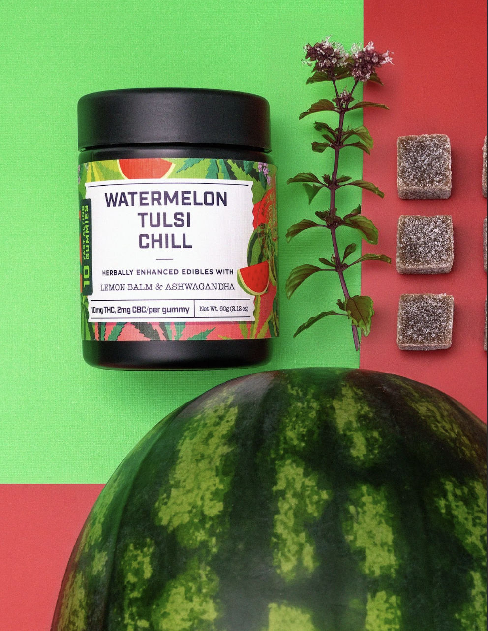 The Watermelon Tulsi Chill fast-acting gummy is made with organic ingredients and flavored with real watermelon juice and real tulsi extract. Enhanced with organic herbs of lemon & ashwagandha and an added minor cannabinoid of 2mg of CBC for the ultimate chill experience!